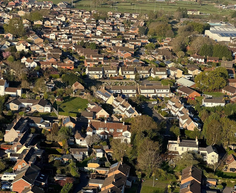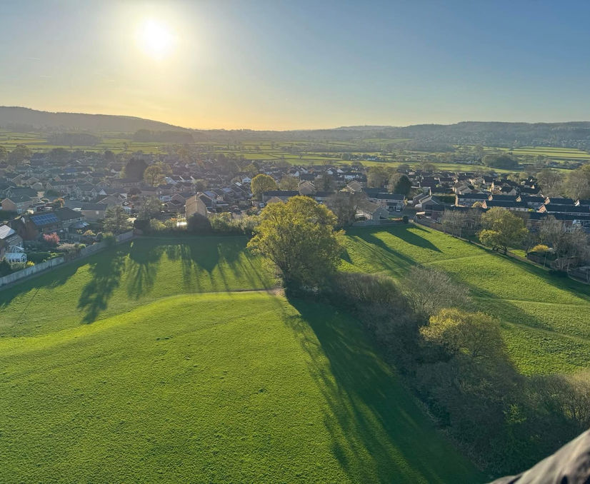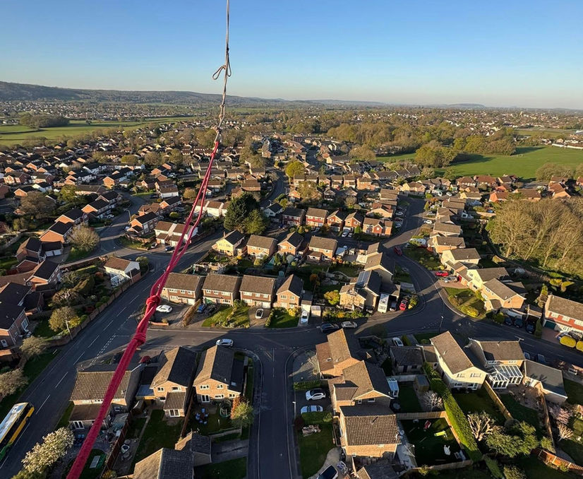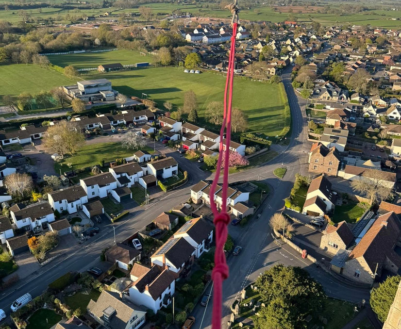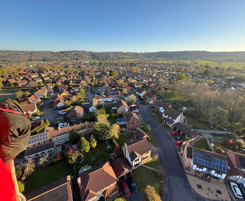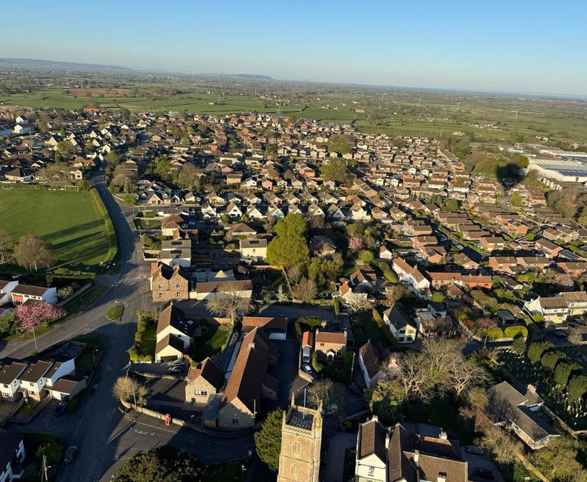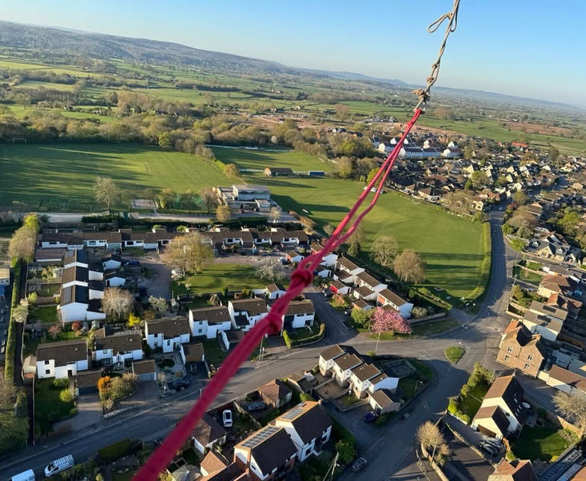RED AND YELLOW AND BLUE AND GREEN: Balloons against a blue sky and green fields across Nailsea